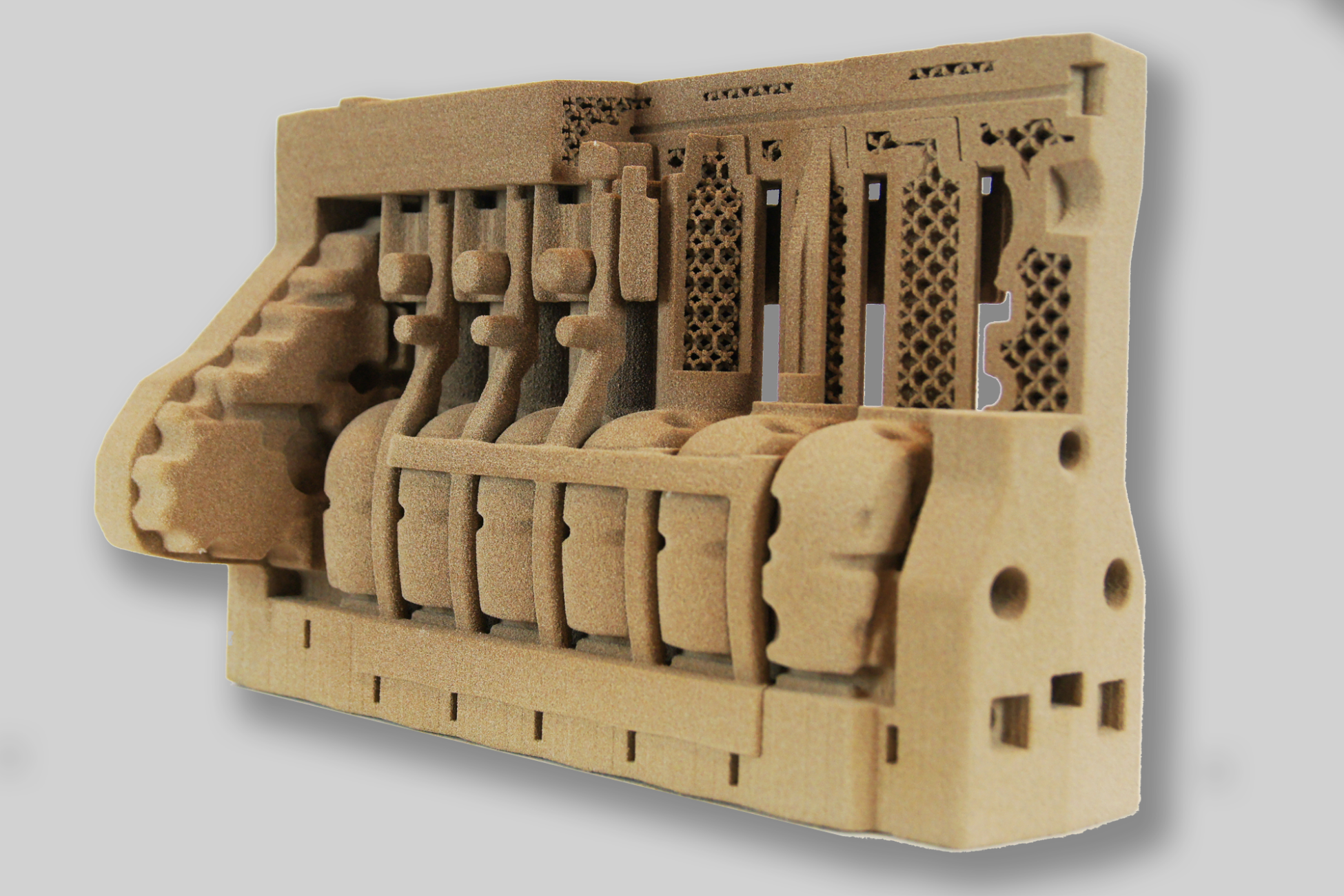 Quarzsand aus dem Binder Jetting weist eine hohe thermische Beständigkeit und eine hohe Festigkeit auf. Zudem lassen sich sehr grosse Bauteile anfertigen. Die Oberfläche des Quarzsandes ist nach dem 3D-Druck rau, bei Bedarf lassen sich entsprechende Flächen nachbearbeiten durch Schleifen. Deshalb eignet sich das Material besonders für Formen und Kerne in Giesserei-Anwendungen, wo später eine hohe Stückzahl an Teilen darin gegossen wird und nur wenige Funktionsflächen benötigt werden.